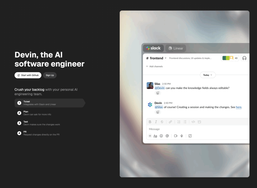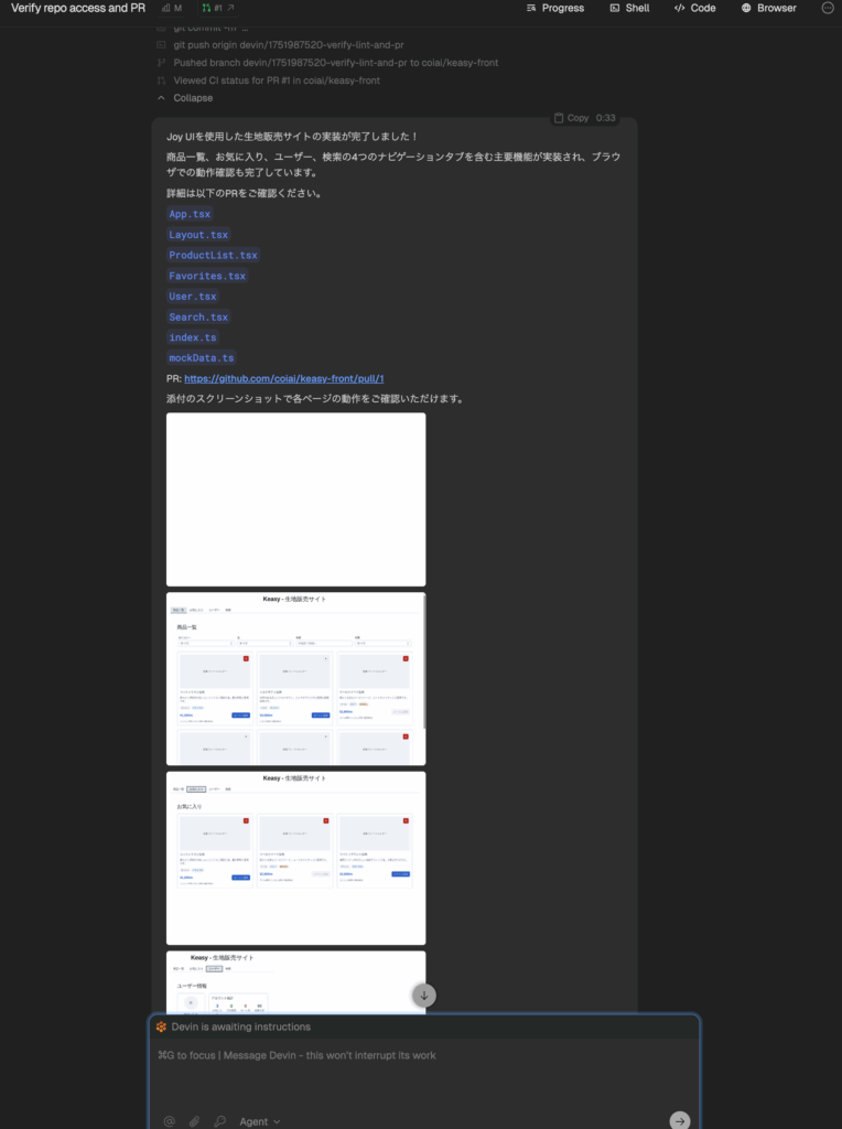 Devint とはGitリポジトリをプルしてDevin内で実行。その後要件を伝えるとAIがコードを編集したものをプルリクエストにて提案してくれるWebアプリです。