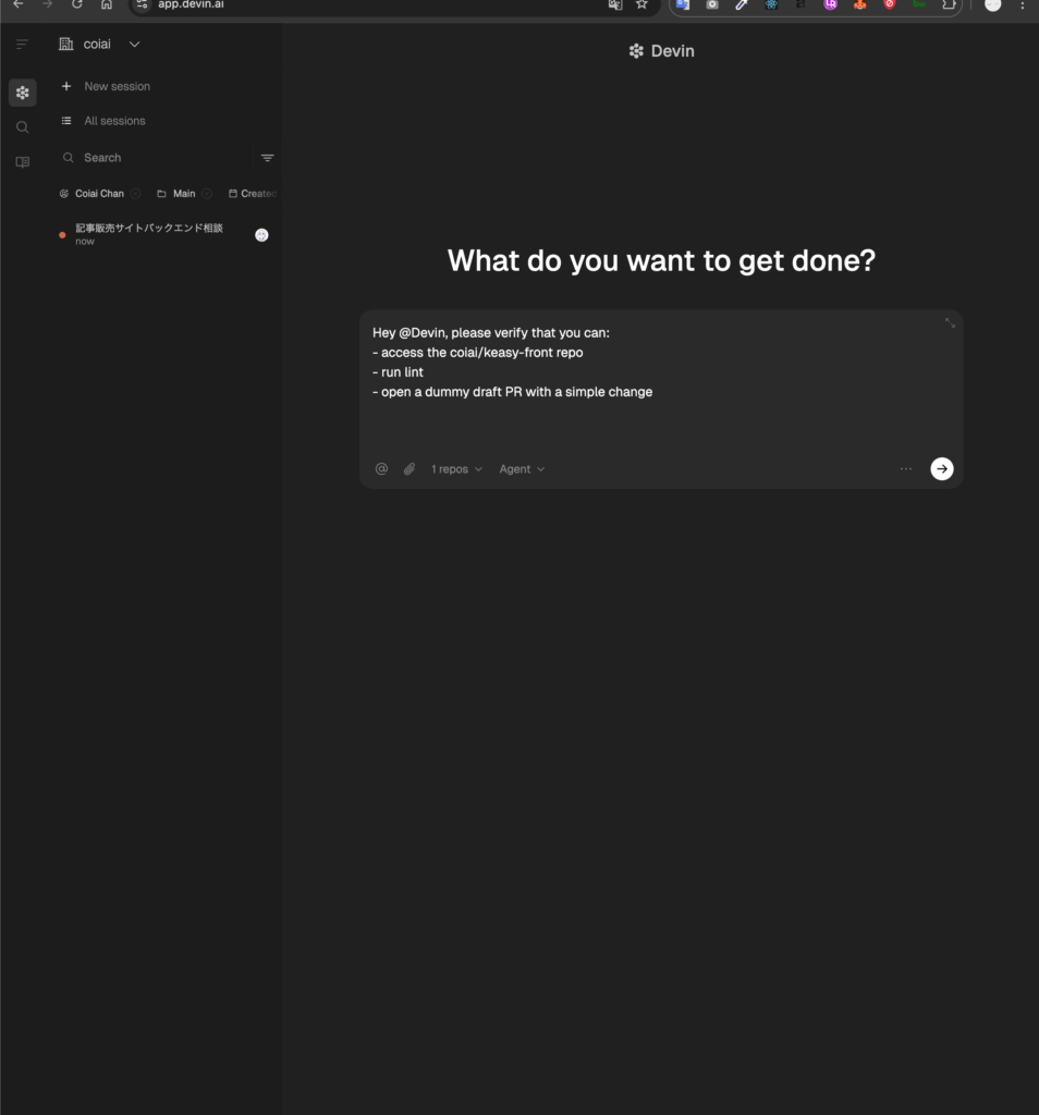 以上までの工程でリポジトリを読み込めたので、session から要件を書いてプルリクエストを出してもらうことが可能です!